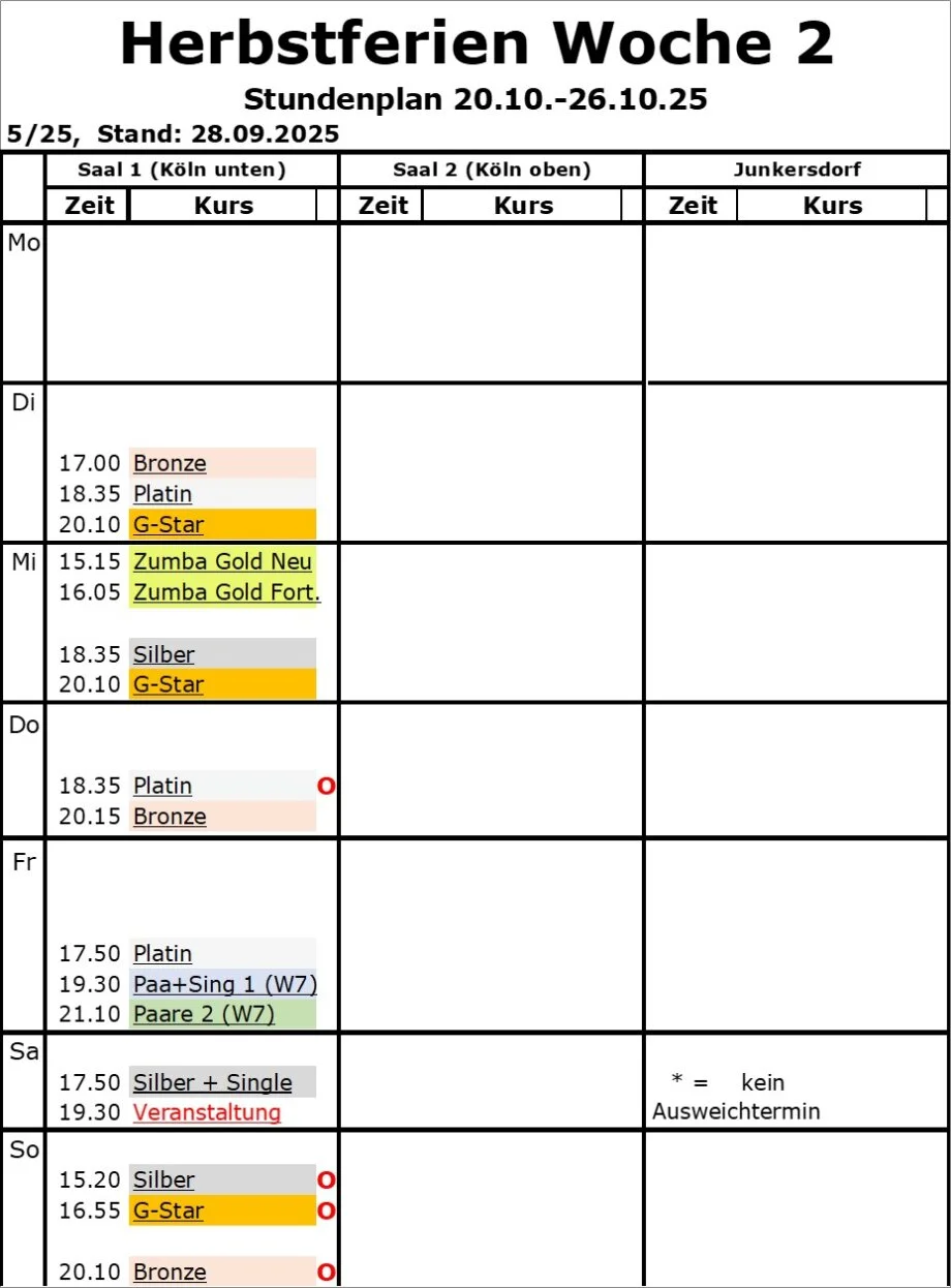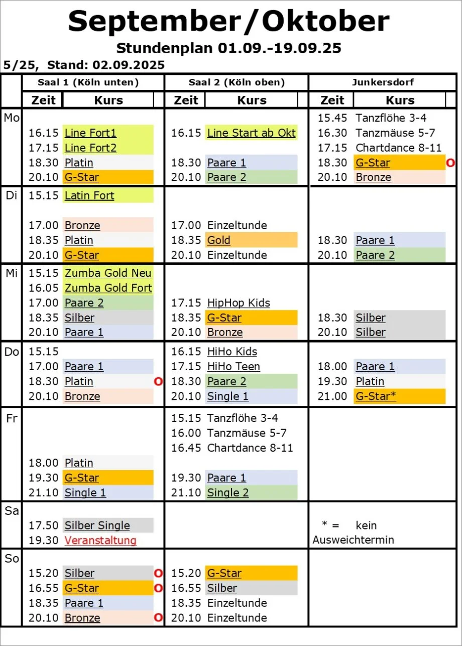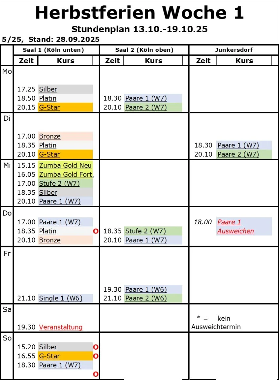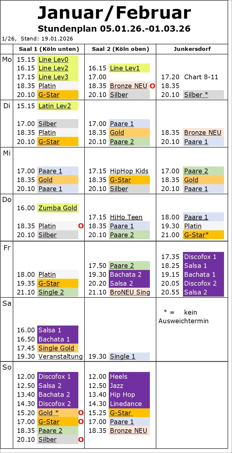 Kurse mit rotem Punkt O werden auf Anfrage zusätzlich online per Zoom-Link hier gestreamt - bitte möglichst 24h vorher anfragen. Das Passwort gibt es bei der Kursleitung oder im Büro.